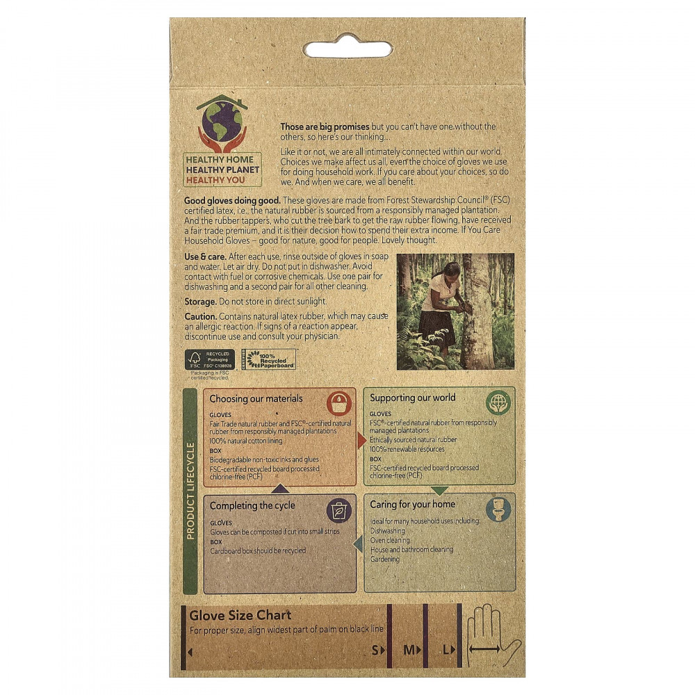 Эти перчатки изготовлены из латекса, сертифицированного Forest Stewartship Council® (FSC). То есть натуральный каучук получают на плантациях, которые управляются экологичным способом. А сборщики каучука, которые обрезают древесную кору, чтобы получить необработанный каучук, получают надбавку от справедливой торговли, и они могут решать, на что потратить дополнительную прибыль. Хозяйственные перчатки If You Care — полезно для природы, полезно для людей. Прекрасная мысли.