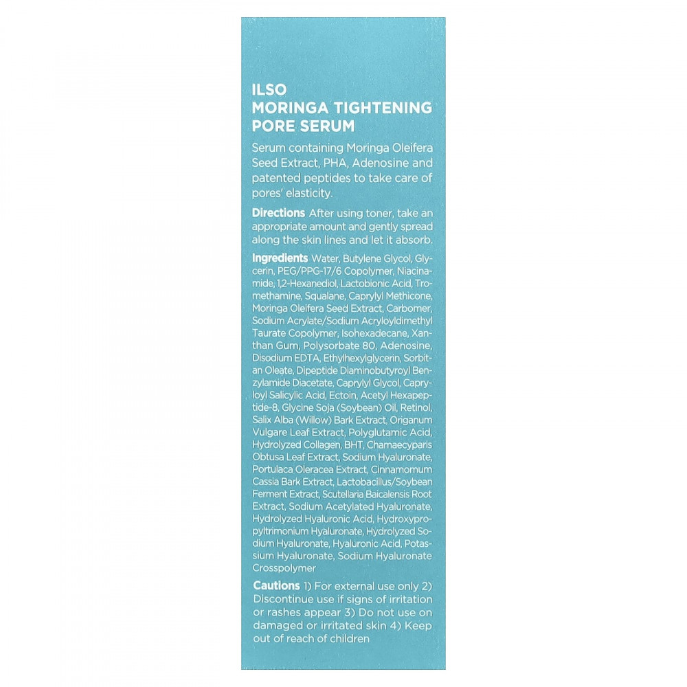 Сыворотка содержит экстракт семян моринги масличной (Moringa oleifera), ПГК, аденозин и запатентованные пептиды для повышения эластичности пор.