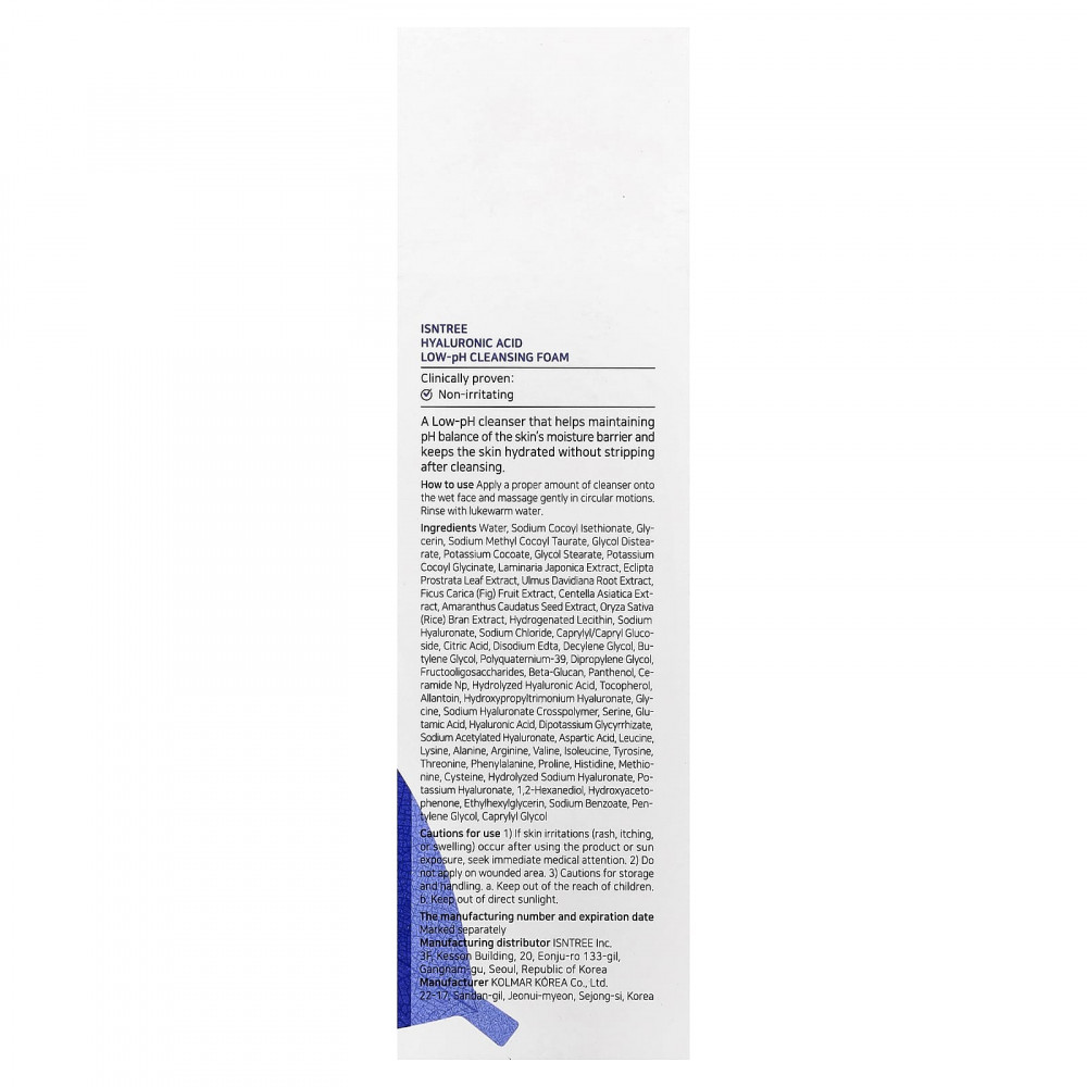 Вода, натрия кокоилизотионат, глицерин, метилкокоилтаурат натрия, гликоль дистеарат, кокоат калия, гликоль стеарат, кокоил глицинат калия, экстракт ламинарии японской (Laminaria japonica), экстракт листьев эклипты простертой (Eclipta prostrata), экстракт корня вяза Давида (Ulmus davidiana), экстракт плодов инжира (Ficus carica), Экстракт центеллы азиатской, экстракт семян амаранта хвостатого (Amaranthus caudatus), экстракт рисовых отрубей (Oryza sativa), Гидрогенизированный лецитин, гиалуронат натрия, хлорид натрия, каприлил/каприл глюкозид, лимонная кислота, Динатрия ЭДТА, дециленгликоль, бутиленгликоль, поликватерниум-39, дипропиленгликоль, фруктоолигосахариды, бета-глюкан, пантенол, Керамид NP, гидролизованная гиалуроновая кислота, Токоферол, Аллантоин, гидроксипропилтримония гиалуронат, глицин, кроссполимер гиалуроната натрия, серин, глутаминовая кислота, гиалуроновая кислота, глицирризат дикалия, ацетилированный гиалуронат натрия, аспарагиновая кислота, лейцин, лизин, Аланин, аргинин, Валин, Изолейцин, тирозин, треонин, Фенилаланин, Пролин, Гистидин, метионин, цистеин, гидролизованный гиалуронат натрия, гиалуронат калия, 1,2-гександиол, гидроксиацетофенон, этилгексилглицерин, бензоат натрия, пентиленгликоль, каприлилгликоль.