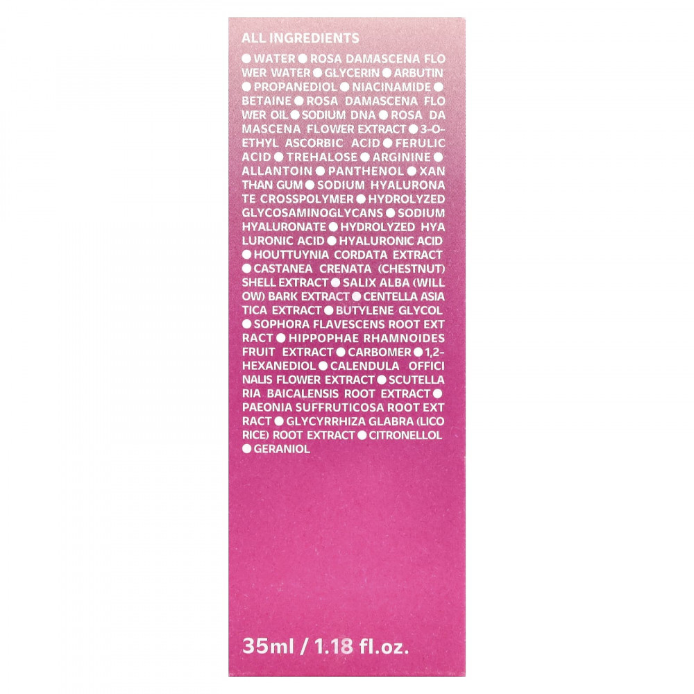 Вода, вода из цветков дамасской розы (Rosa damascena), глицерин, арбутин, пропандиол, никотинамид, бетаин, масло из цветков дамасской розы (Rosa damascena), ДНК натрия, экстракт цветков дамасской розы (Rosa damascena), 3-O-этил-аскорбиновая кислота, феруловая кислота, трегалоза, аргинин и аллантоин, пантенол, ксантановая камедь, кроссполимер гиалуроната натрия, гидролизованные гликозаминогликаны, гиалуронат натрия, гидролизованная гиалуроновая кислота, гиалуроновая кислота, экстракт хауттюйнии (Houttuynia cordata), экстракт скорлупы каштана (castanea crenata), экстракт коры ивы (Salix alba), экстракт готу колы (Centella asiatica), бутиленгликоль, экстракт корня софоры желтоватой (Sophora flavescens), экстракт плодов облепихи крушиновидной (Hippophae rhamnoides), карбомер, 1,2-гександиол, экстракт цветков календулы (Calendula officinalis), экстракт корня шлемника (Scutellaria baicalensis), экстракт корня пиона (Paeonia suffruticosa), экстракт корня солодки (Glycyrrhiza glabra), цитронеллола, гераниол.