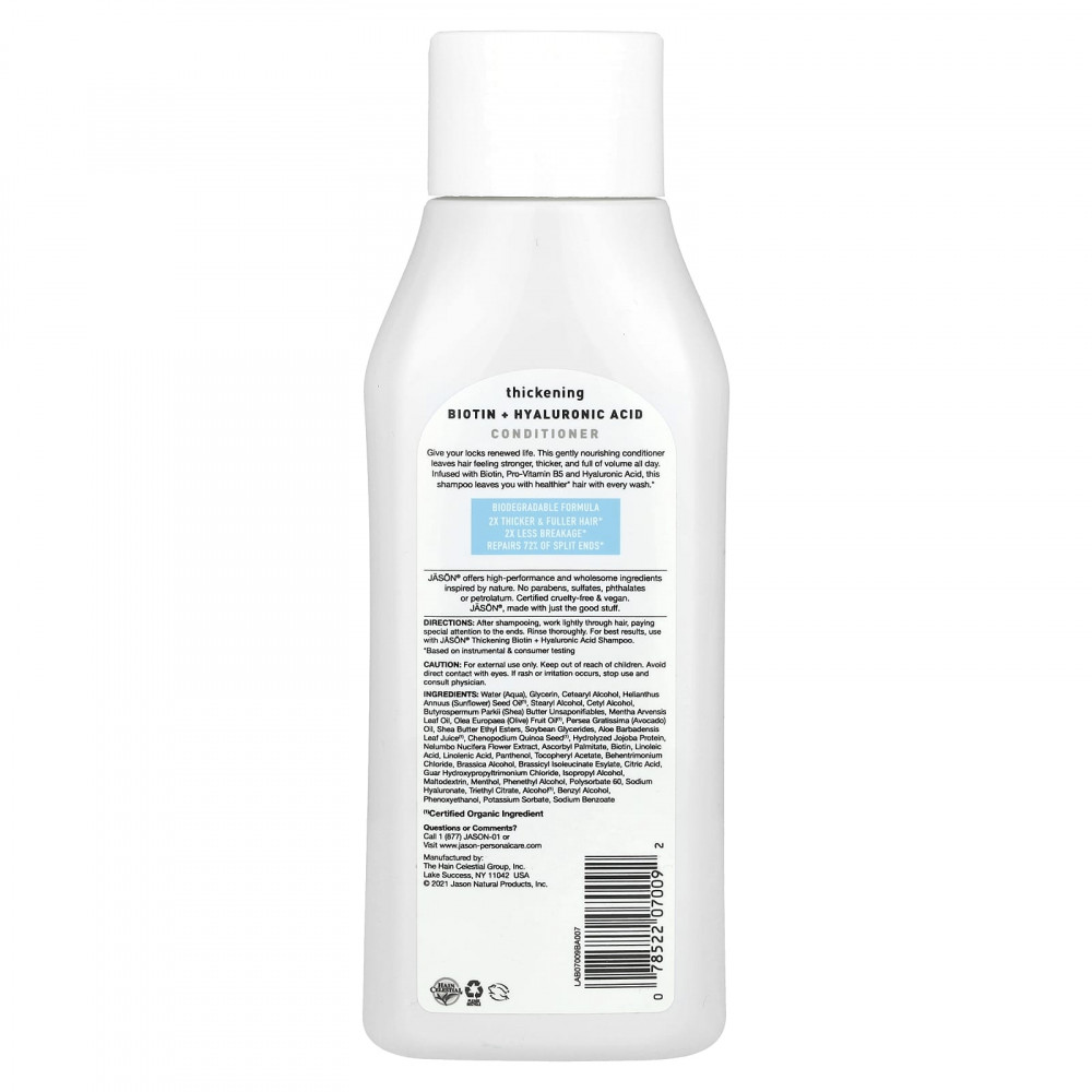 После мытья головы легкими движениями распределите по волосам, уделяя особое внимание кончикам. Тщательно смойте водой. Для достижения наилучших результатов используйте вместе с шампунем для густоты волос с биотином и гиалуроновой кислотой Jason®.