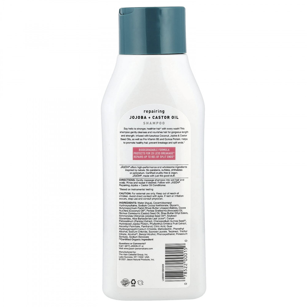 Мягкими массирующими движениями нанесите шампунь на влажные волосы и кожу головы. Смойте и при желании повторите. Затем нанесите восстанавливающий кондиционер с жожоба и касторовым маслом отJason® .