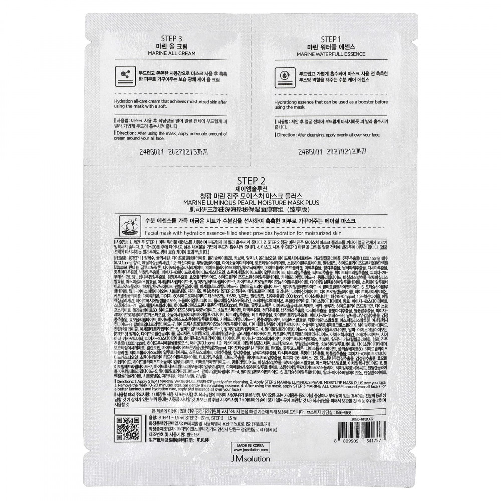 Морская светящаяся маска: 1. После очищения аккуратно нанесите STEP 1 MARINE WATERFULL ESSENCE. 2. Нанесите увлажняющую маску с морским перламутром STEP 2 на лицо. 3. Снимите маску через 10–20 минут, аккуратно похлопайте оставшуюся эссенцию. 4. После использования маски нанесите STEP 3 MARINE ALL CREAM на все лицо. (Для лучшего сияния и увлажнения нанесите средство на все лицо и помассируйте его.)