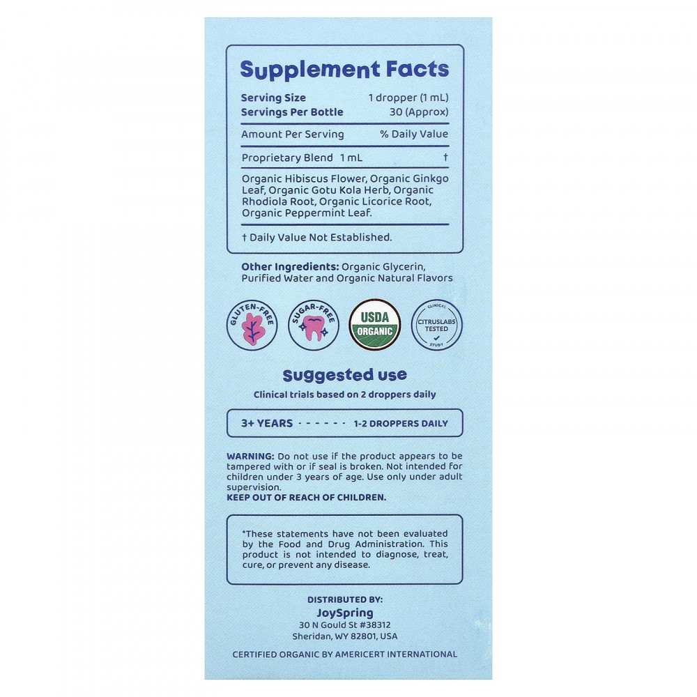 | Запатентованная смесь органические цветы гибискуса, органические листья гинкго билоба, органическая трава готу колы, органический корень родиолы, органический корень солодки, органические листья перечной мяты. | 1 мл | † |