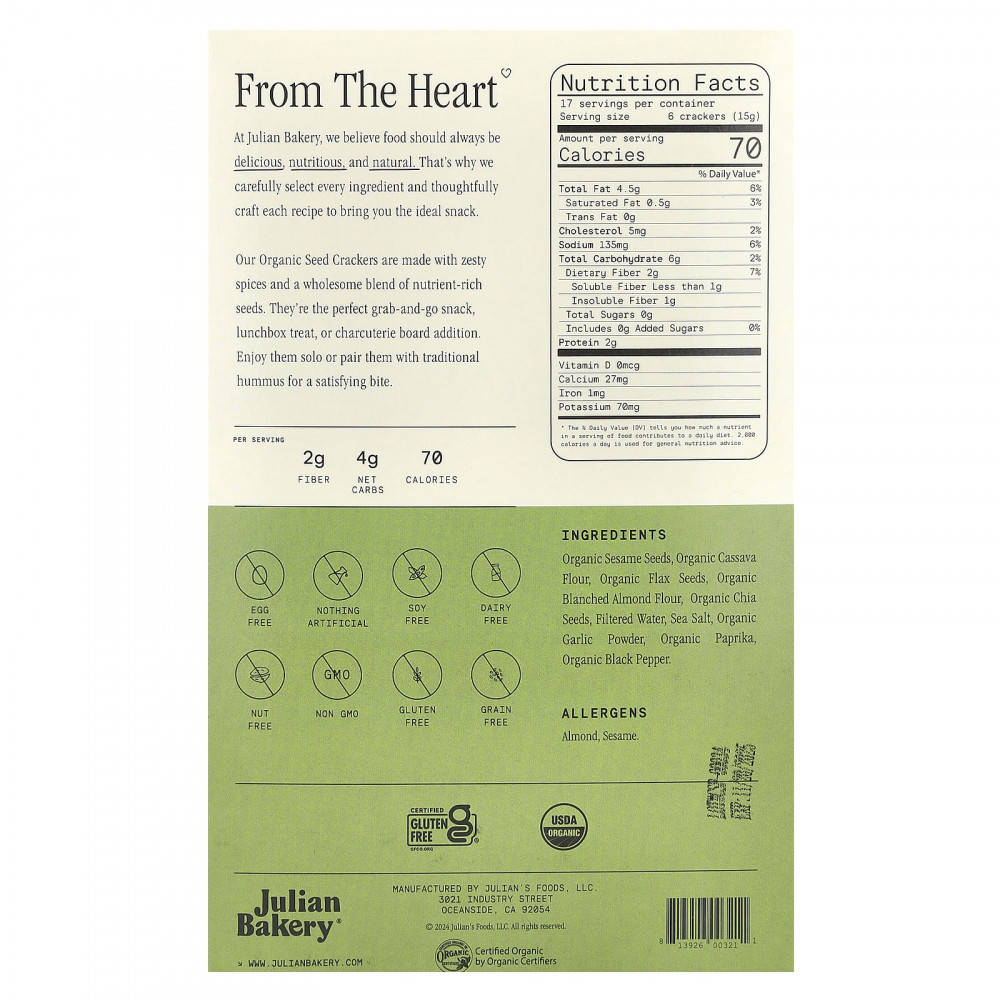 Эти органические крекеры в стиле палео изготовлены из миндальной муки, льна и специй. Эти крекеры, содержащие всего 5 чистых углеводов * в одной порции (14 граммов), идеально подходят для любой низкоуглеводной диеты и определенно одобрены для любого палеодиета.