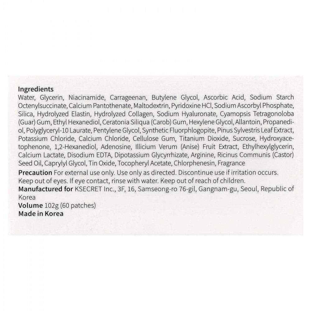 Вода, глицерин, никотинамид, каррагинан, бутиленгликоль, аскорбиновая кислота, натрия крахмал октенилсукцинат, пантотенат кальция, мальтодекстрин, пиридоксина гидрохлорид, аскорбил фосфат натрия, диоксид кремния, гидролизованный эластин, гидролизованный коллаген, гиалуронат натрия, гуаровая камедь (Cyamopsis tetragonoloba), этил гександиол, камедь рожкового дерева (Ceratonia siliqua), гексиленгликоль, аллантоин, пропандиол, полиглицерил-10 лаурат, пентилен гликоль, синтетический фторфлогопит, экстракт хвои сосны (Pinus sylvestris), хлорид калия, хлорид кальция, целлюлозная камедь, диоксид титана, сахароза, гидроксиацетофенон, 1,2-гександиол, аденозин, экстракт плодов аниса звездчатого (Illicium verum), этилгексилглицерин, лактат кальция, двунатриевая ЭДТК, дикалия глицирризат, аргинин, касторовое масло (Ricinus communis), каприлилгликоль, оксид олова, токоферилацетат, хлорфенезин, отдушка.