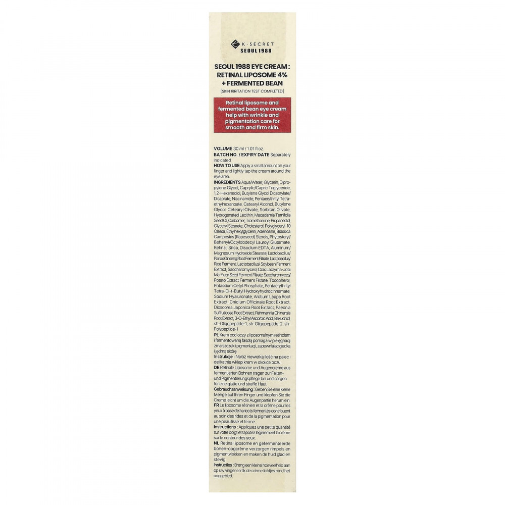 Вода, глицерин, дипропиленгликоль, каприловый/каприновый триглицерид, 1,2-гександиол, бутиленгликоль дикаприлат/дикапрат, Ниацинамид, пентаэритриттетраэтилгексаноат, Цетеариловый спирт, бутиленгликоль, цетеарилоливат, сорбитан оливат, Гидрогенизированный лецитин, Масло семян макадамии тернифолии, Карбомер, трометамин, пропандиол, глицерил стеарат, холестерин, полиглицерил-10 олеат, этилгексилглицерин, аденозин, рапсовые стеролы (Brassica campestris), фитостерил/бегенил/октилдодецил лауроил глутамат, ретиналь, кремнезем, Динатрия ЭДТА, гидроксид алюминия/магния и стеарат, ферментированный фильтрат лактобактерий/корня женьшеня (Panax ginseng), фермент лактобактерий/риса, ферментированный экстракт лактобактерий/соевых бобов, сахаромицеты/Coix lacryma-jobima-yuen, ферментированный фильтрат семян, сахаромицеты/ферментированный фильтрат картофельного экстракта, Токоферол, цетил фосфат калия, пентаэритритил тетра-ди-т-бутилгидроксициннамат, гиалуронат натрия, экстракт корня лопуха (Arctium lappa), экстракт корня бороздоплодника лекарственного (Cnidium officinale), экстракт корня диоскореи японской (Dioscorea japonica), экстракт корня пиона (Paeonia suffruticosa), экстракт корня ремании (Rehmannia chinensis), 3-О-этил-аскорбиновая кислота, бакучиол, sh-олигопептид-1, sh-олигопептид-2, sh-полипептид-1.