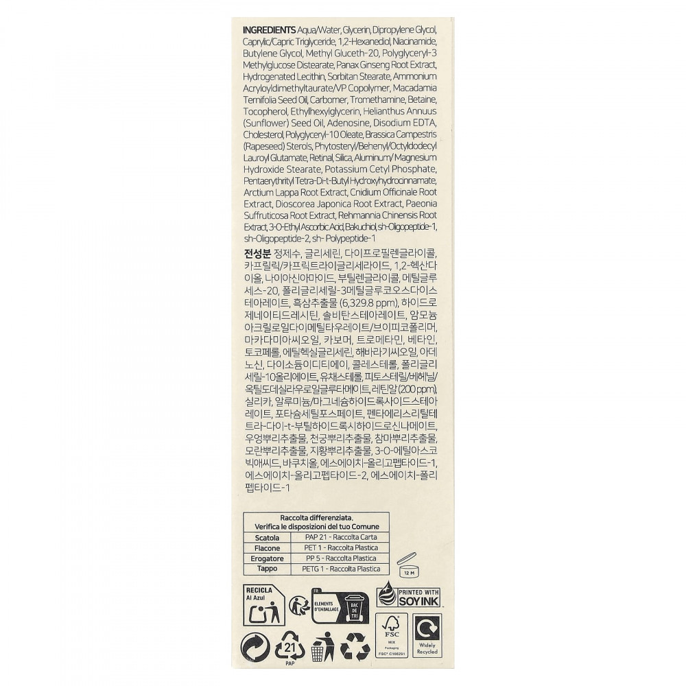 Вода, глицерин, дипропиленгликоль, каприловый/каприновый триглицерид, 1,2-гександиол, Ниацинамид, бутиленгликоль, метилглюсет-20, полиглицерил-3 метилглюкозы дистеарат, экстракт корня женьшеня (Panax ginseng), Гидрогенизированный лецитин, сорбитан стеарат, аммоний акрилоилдиметилтаурат/ВП сополимер, Масло семян макадамии тернифолии, Карбомер, трометамин, Бетаин, Токоферол, этилгексилглицерин, Масло семян подсолнечника, аденозин, Динатрия ЭДТА, холестерин, полиглицерил-10 олеат, рапсовые стеролы (Brassica campestris), фитостерил/бегенил/октилдодецил лаурил глютамат, ретиналь, кремнезем, гидроксид алюминия/магния и стеарат, цетил фосфат калия, пентаэритритил тетра-ди-т-бутилгидроксициннамат, экстракт корня лопуха (Arctium lappa), экстракт корня бороздоплодника лекарственного (Cnidium officinale), экстракт корня диоскореи японской (Dioscorea japonica), экстракт корня пиона (Paeonia suffruticosa), экстракт корня ремании (Rehmannia chinensis), 3-O-этил-аскорбиновая кислота, бакучио, sh-олигопептид-1, sh-олигопептид-2, sh-полипептид-1.