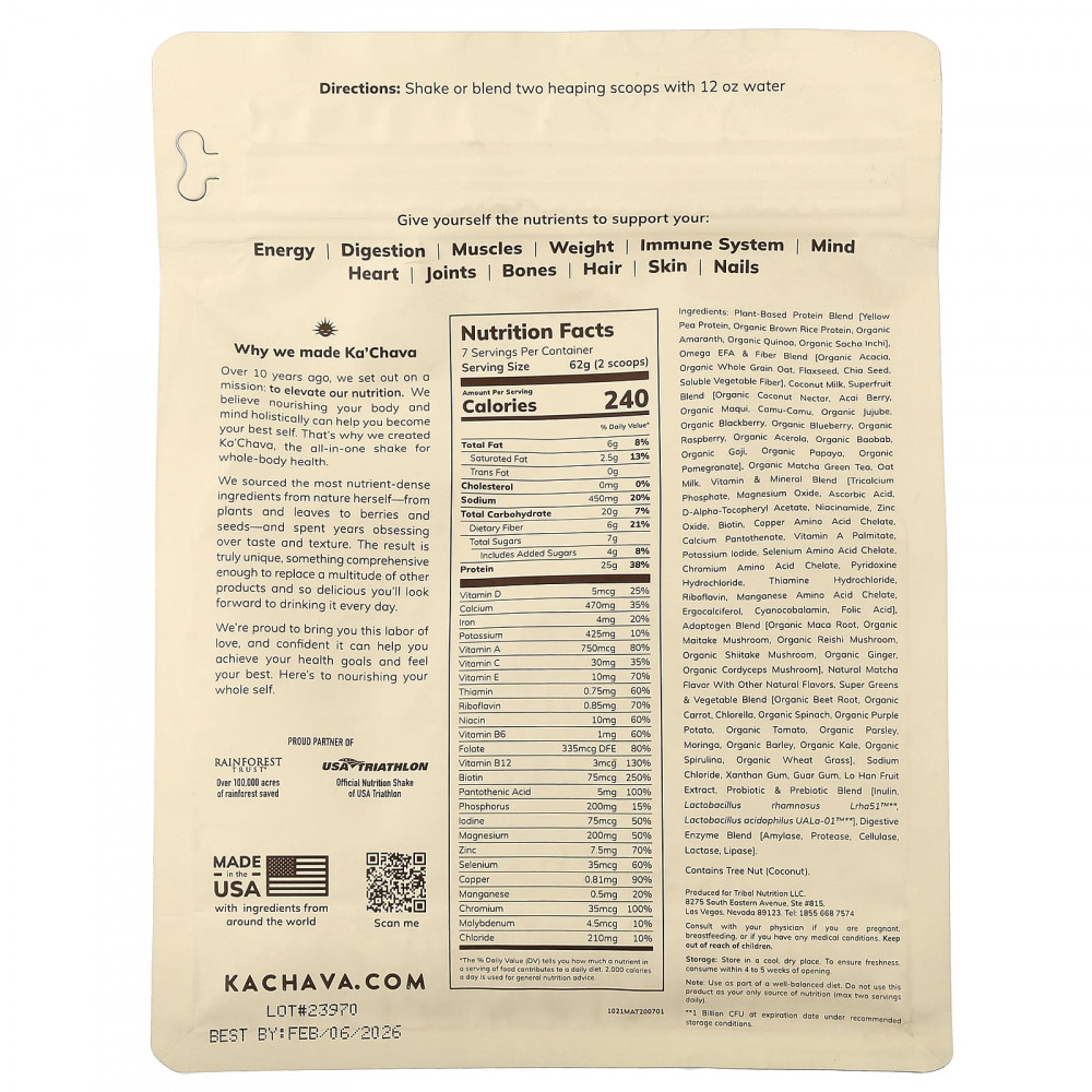 Смесь растительных белков [протеин из желтого гороха, протеин из органического коричневого риса, органический амарант, органическое киноа, органический инчи (сача инчи)], омега эссенция и с)месь клетчатки [органическая акация, органический цельнозерновой овес, льняное семя, семена чиа, растворимая растительная клетчатка], кокосовое молоко, смесь суперфруктов [органический кокосовый нектар, ягоды асаи, органический аристотелия, каму-каму, органический мармелад, органическая ежевика, органическая голубика, органическая малина, органическая ацерола, органический баобаб, органические ягоды годжи, органическая папайя, органический гранат], органический зелёный чай матча, овсяное молоко, Vitamin & смесь минералов [трикальций фосфат, оксид магния, аскорбиновая кислота, d-альфа-токоферилацетат, никотинамид, оксид цинка, биотин, хелат аминокислоты меди, пантотенат кальция, витамин A (пальмитат), йодид калия, хелат аминокислоты селена, хелат аминокислоты хрома, пиридоксина гидрохлорид, рибофлавин, хелат аминокислоты марганца, эргокальциферол, цианокобаламин, фолиевая кислота], смесь адаптогенов [корень органической маки, органический гриб-баран, органический гриб рейши, органический гриб шиитаке, органический имбирь, органический гриб кордицепс], натуральный ароматизатор «матча» и другие натуральные ароматизаторы, суперзелень и о)вощная смесь [органический корнеплод свеклы, органическая морковь, хлорелла, органический шпинат, органический фиолетовый картофель, органический томат, органическая петрушка, моринга, органический ячмень, органическая капуста, органическая спирулина, органические ростки пшеницы], хлорид натрия, ксантановая камедь, гуаровая камедь, экстракт плодов архата, пробиотик смесь пребиотиков [инулин, лактобактерии рамнозус (Lactobacillus rhamnosus) Lrha51™**, ацидофильные лактобактерии (Lactobacillus acidophilus) uala-01™**], смесь пищеварительных ферментов [амилаза, протеаза, целлюлаза, лактаза, липаза].