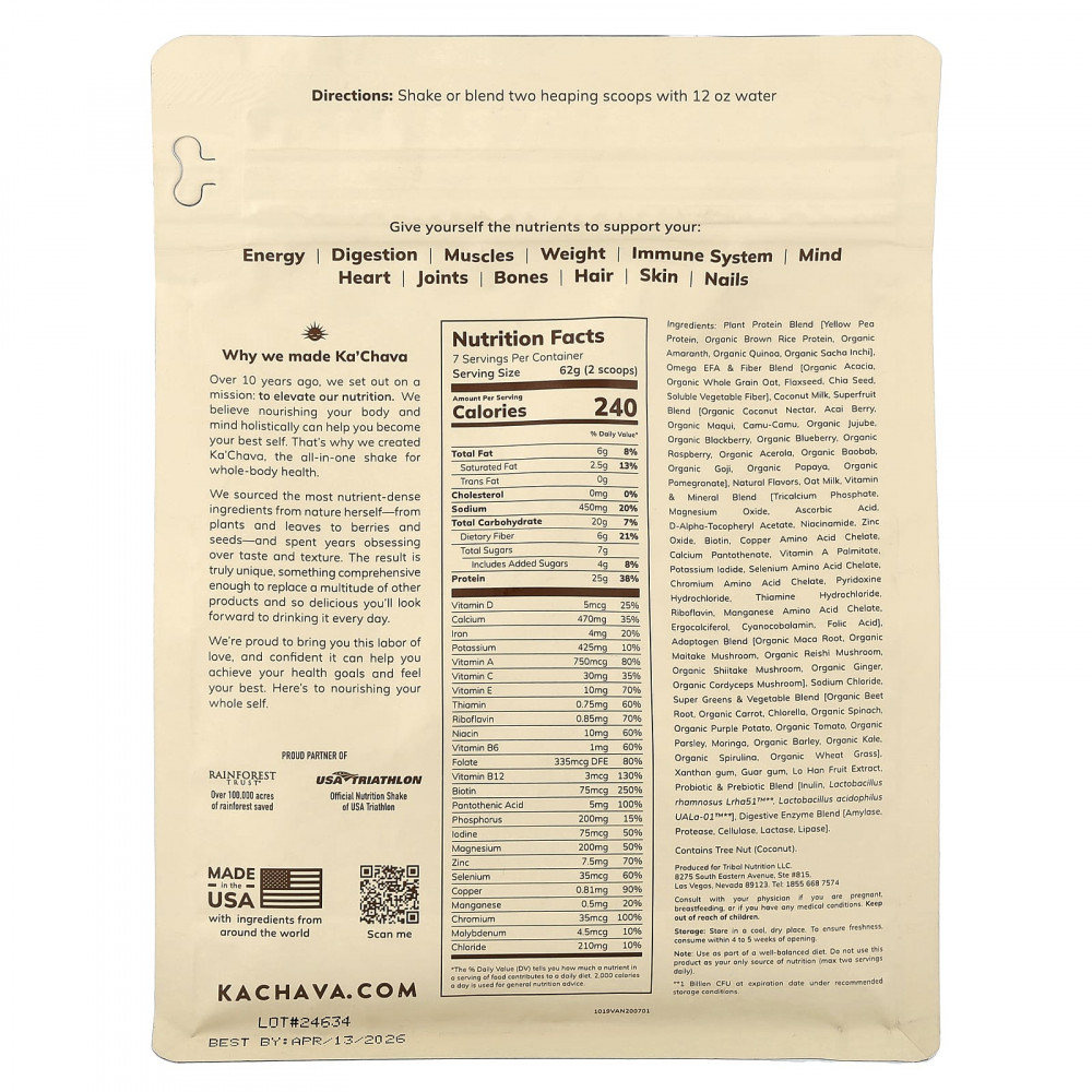 Смесь растительных белков [протеин из желтого гороха, протеин из органического коричневого риса, органический амарант, органическое киноа, органический инчи (сача инчи)], омега эссенция и с)месь клетчатки [органическая акация, органический цельнозерновой овес, льняное семя, семена чиа, растворимая растительная клетчатка], кокосовое молоко, смесь суперфруктов [органический кокосовый нектар, ягоды асаи, органический аристотелия, каму-каму, органический мармелад, органическая ежевика, органическая голубика, органическая малина, органическая ацерола, органический баобаб, органические ягоды годжи, органическая папайя, органический гранат], натуральные ароматизаторы, овсяное молоко, Vitamin & смесь минералов [трикальций фосфат, оксид магния, аскорбиновая кислота, d-альфа-токоферилацетат, никотинамид, оксид цинка, биотин, хелат аминокислоты меди, пантотенат кальция, витамин A (пальмитат), йодид калия, хелат аминокислоты селена, хелат аминокислоты хрома, пиридоксина гидрохлорид, тиамина гидрохлорид, рибофлавин, хелат аминокислоты марганца, эргокальциферол, цианокобаламин, фолиевая кислота], смесь адаптогенов [корень органической маки, органический гриб-баран, органический гриб рейши, органический гриб шиитаке, органический имбирь, органический гриб кордицепс], хлорид натрия, суперзелень и о)вощная смесь [органический корнеплод свеклы, органическая морковь, хлорелла, органический шпинат, органический фиолетовый картофель, органический томат, органическая петрушка, моринга, органический ячмень, органическая капуста, органическая спирулина, органические ростки пшеницы], ксантановая камедь, гуаровая камедь, экстракт плодов архата, пробиотик смесь пребиотиков [инулин, лактобактерии рамнозус (Lactobacillus rhamnosus) Lrha51™**, ацидофильные лактобактерии (Lactobacillus acidophilus) uala-01™**], смесь пищеварительных ферментов [амилаза, протеаза, целлюлаза, лактаза, липаза].