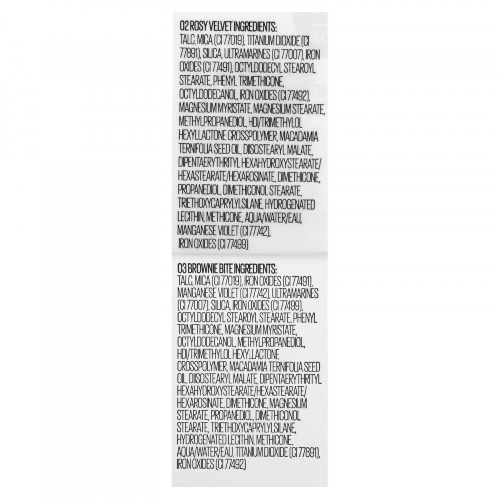 02 бархатно-розовый: Тальк, слюда (CI 77019), диоксид титана (CI 77891), диоксид кремния, ультрамарины (CI 77007), оксиды железа (CI 77491), октилдодецил стеароил стеарат, фенилтриметикон, октилдодеканол, оксиды железа (CI 77492), миристат магния, стеарат магния, метилпропандиол, HDI/триметилол гексалактон кроссполимер, масло макадамии (Macadamia ternifolia), диизостеарил малат, дипентаэритритил гексагидроксистеорат/гексастерат/гексаросинат, диметикон, пропандиол, диметиконол стеарат, триэтоксикаприлилсилан, гидрогенизированный лецитин, метикон, вода, краситель темно-фиолетовый (CI77742), оксиды железа (CI 77499).