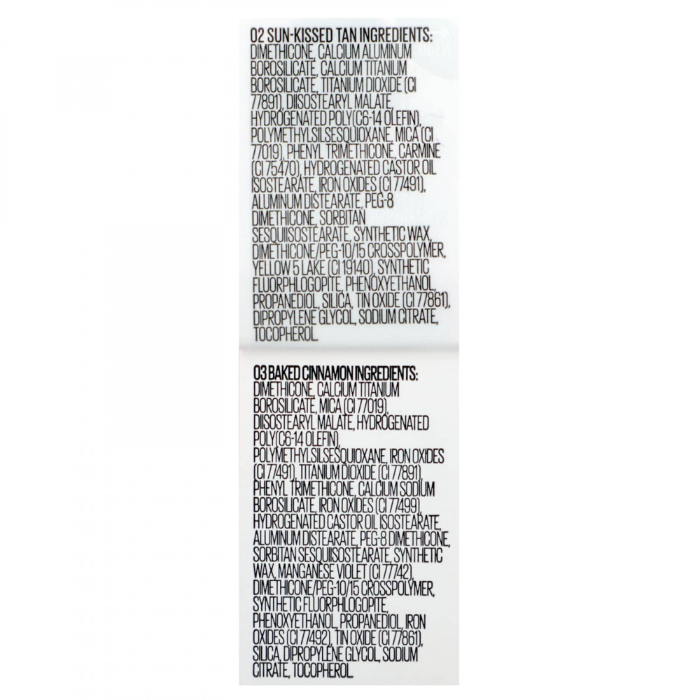 03 запеченная корица: диметикон, боросиликат кальция и титана, слюда (CI 77019). диизостеарил малат, гидрогенизированный поли(c6-14 олефин) полиметилсилсесквиоксан, оксиды железа (CI 77491), диоксид титана (CI 77891) фенилтриметикон, кальций натрий боросиликат, оксиды железа (CI 77499), изостеарат гидрогенизированного касторового масла, дистеарат алюминия, ПЭГ-8 диметикон, сорбитан сесквиизостеарат, синтетический воск, краситель темно-фиолетовый (CI 77742) диметикон/ПЭГ-10/15 кроссполимер, синтетический фторфлогопит, феноксиэтанол, пропандиол, оксиды железа (CI 77492), оксид олова (CI 7/861). диоксид кремния, дипропиленгликоль, цитрат натрия, токоферол.