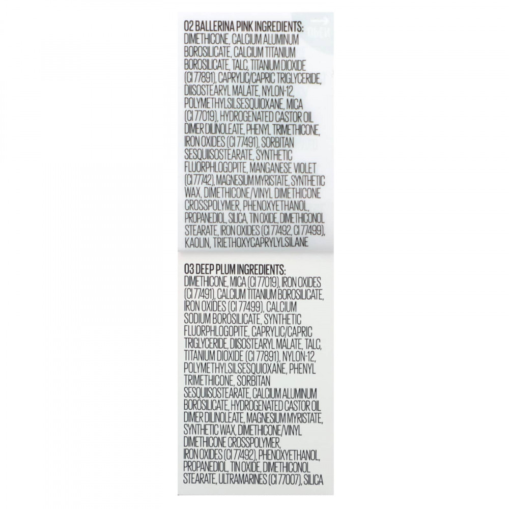 02 розовый (Ballerina Pink): диметикон, кальций алюминий боросиликат, боросиликат кальция и титана, тальк, диоксид титана (CI 77891), каприловый/каприновый триглицерид, диизостеарил малат, нейлон-12, полиметилсилсесквиоксан, слюда (CI 77019), гидрогенизированное касторовое масло димердилинолеат, фенилтриметикон, оксиды железа (CI 77491), сорбитан сесквиизостеарат, синтетический фторфлогопит, краситель темно-фиолетовый (CI 77742), миристат магния, синтетический воск, диметикон/винил диметикон кроссполимер, феноксиэтанол, пропандиол, диоксид кремния, оксид олова, диметиконол стеарат, оксиды железа (CI 77492, CI 77499), каолин, триэтоксикаприлилсилан