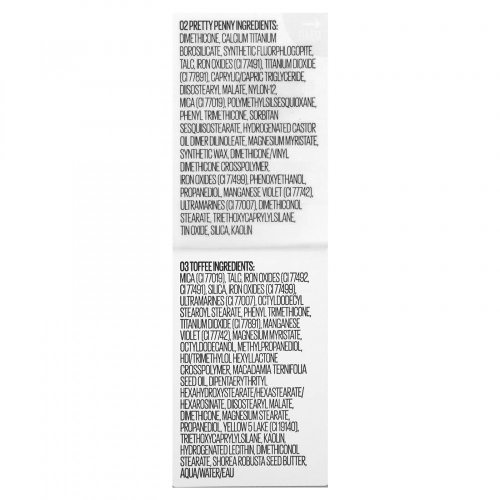 02 пенни: диметикон, боросиликат кальция и титана, синтетический фторфлогопит, тальк, оксиды железа (CI 77491), диоксид титана (CI 77891), каприловый/каприновый триглицерид, диизостеарил малат, нейлон-12, слюда (CI 77019), полиметилсилсесквиоксан, фенилтриметикон, сорбитан сесквиизостеарат, гидрогенизированное касторовое масло димердилинолеат, миристат магния, синтетический воск, диметикон/винил диметикон кроссполимер, оксиды железа (CI 77499), феноксиэтанол, пропандиол, краситель темно-фиолетовый (CI 77742), ультрамарины (CI 77007), диметиконол стеарат, триэтоксикаприлилсилан, оксид олова, диоксид кремния, каолин.