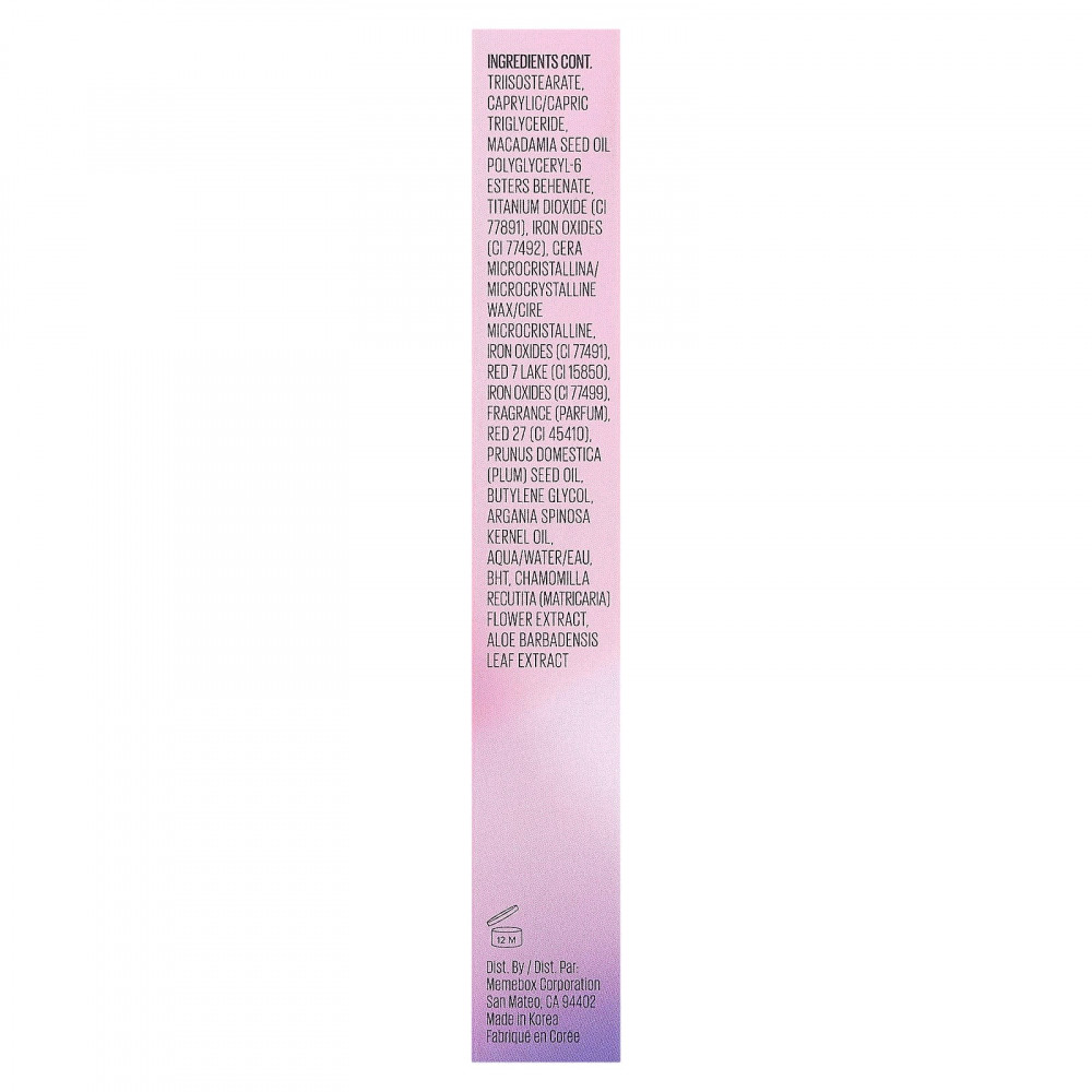 Гидрогенизированный полиизобутен, пентаэритритил тетраизостеарат, дифенил силокси фенилтриметикон, дипентаэритритил гексагидроксистеорат/гексастерат/гексаросинат, триметилсилоксифенил диметикон фитостерил/изостеарил/цетил/стеарил/бегенил димер дилинолеат, полиэтилен, полиглицерил-2, триизостеарат, каприловый/каприновый триглицерид, масло семян макадамии, полиглицерил-6 эфиры бегенат, диоксид титана (CI 77891), оксиды железа (CI 77492), микрокристаллический воск (Cera микрокристаллический)/микрокристаллический воск/микрокристаллический воск, оксиды железа (CI 77491), краситель красный 7 лак (CI 15850), оксиды железа (CI 77499), отдушка, краситель красный 27 (CI 45410). масло из косточек сливы (Prunus domestica), бутиленгликоль, аргановое масло (Argania spinosa), вода, бутилгидрокситолуол, экстракт цветков ромашки лекарственной (Chamomilla recutita), экстракт листьев алоэ вера (Aloe barbadensis).
