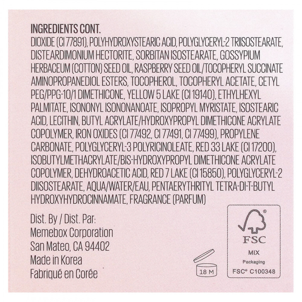 диметикон, диметикон/винил диметикон кроссполимер, изододекан, диизостеарил малат, диметикон кроссполимер, диоксид титана (CI 77891), полигидроксистеариновая кислота, полиглицерил-2 триизостеарат, дистеардимония гекторит, сорбитан изостеарат, масло из семян хлопка (Gossypium herbaceum), малиновое масло/токоферил сукцинат аминопропандиола, токоферол, токоферилацетат, цетил ПЭГ/ППГ-10/1 диметикон, краситель желтый 5 лак (CI 19140), этилгексил пальмитат, изононил изононаноат, изопропил миристат, изостеариновая кислота, лецитин, бутил акрилат/гидроксипропил диметикон акрилат сополимер, оксиды железа (CI 77492, CI 77491, CI 77499), пропиленкарбонат, полиглицерил-3-полирицинолеат, краситель красный 33 лак (CI 17200), изобутилметакрилат/бис-гидроксипропил диметикон акрилат сополимер, дегидроуксусная кислота, краситель красный 7 лак (CI 15850), полиглицерил-2 диизостеарат, вода, пентаэритритил тетра-ди-трет-бутил гидроксигидроциннамат, отдушка (парфюмерная композиция).