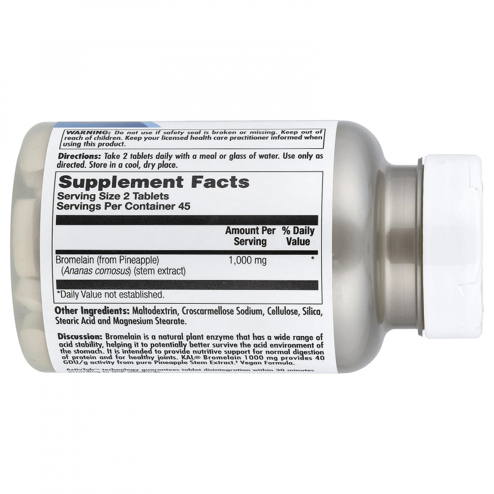 Описание. Бромелаин — это натуральный растительный фермент, который обладает широким спектром стабильности в кислой среде, что помогает ему лучше выживать в кислой среде желудка. Она предназначена для обеспечения питательной поддержки нормального переваривания белка и здоровья суставов. Бромелаин KAL®, 1000 мг, обеспечивает активность 40 GDU/г из чистого экстракта стеблей ананаса.