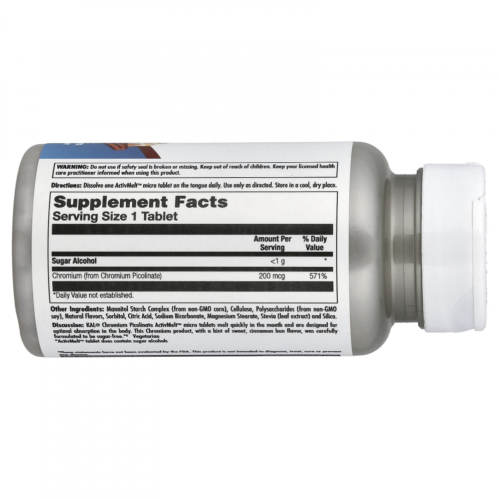 Описание. Микротаблетки с пиколинатом хрома ActivMelt™ от KAL® быстро тают во рту и оптимально усваиваются в организме. Этот продукт с хромом со сладким вкусом булочки с корицей не содержит сахара*.