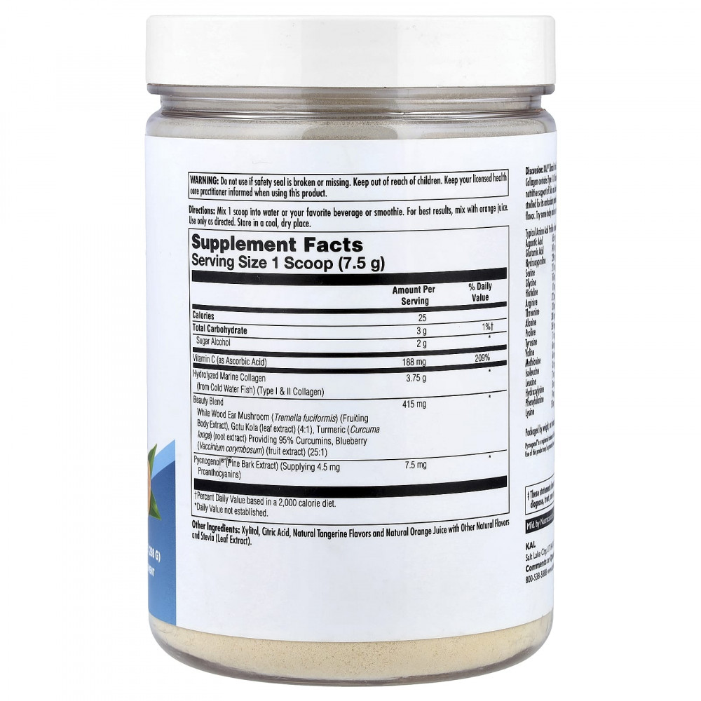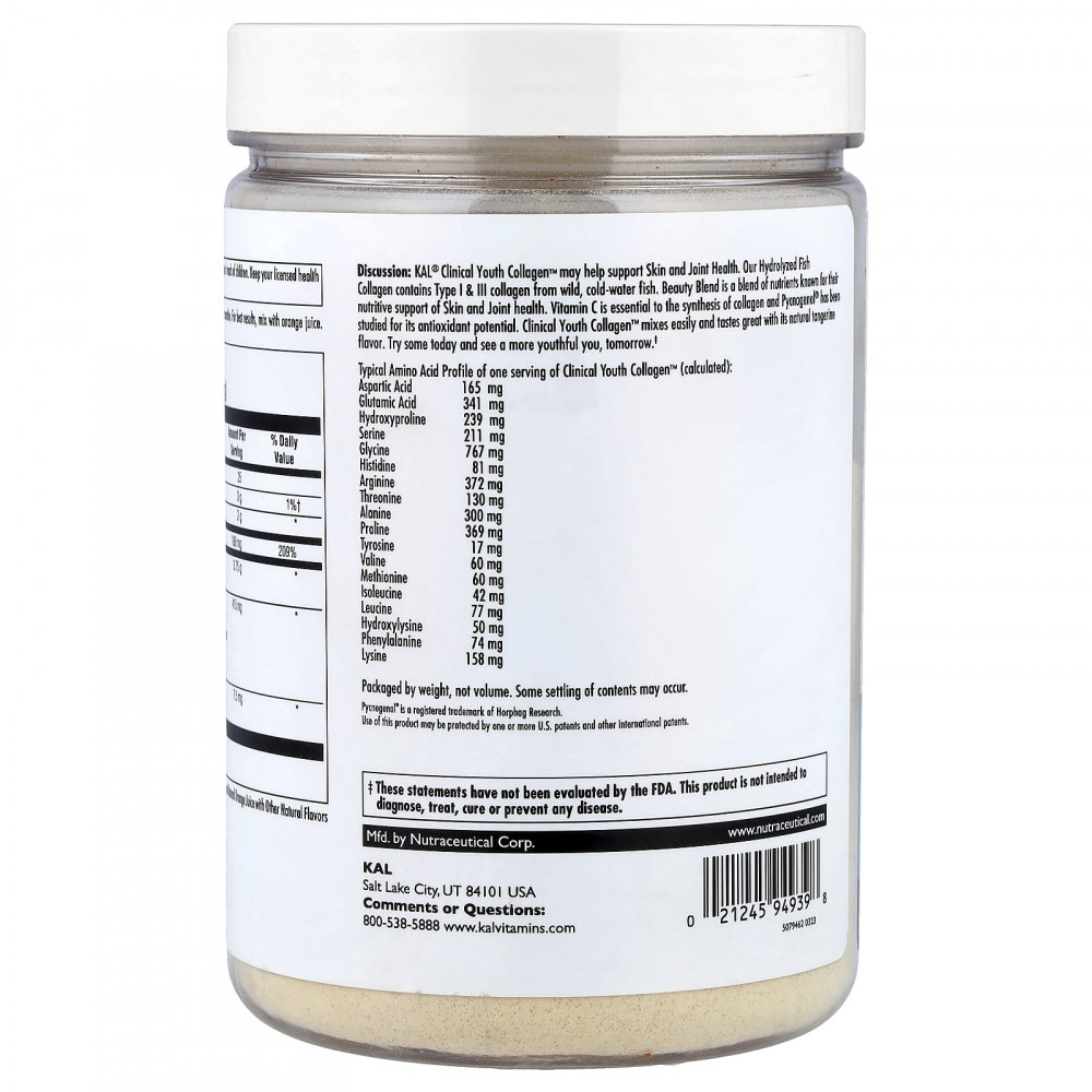 Описание. KAL® Clinical Youth Collagen ™ может поддерживать здоровье кожи и суставов. Наш гидролизованный рыбий коллаген содержит коллаген типа I и III из диких холодноводных рыб. Beauty Blend - это смесь питательных веществ, известных своими питательными веществами для здоровья кожи и суставов. Витамин С необходим для синтеза коллагена, а антиоксидантный потенциал Pycnogenol® был изучен. Clinical Youth Collagen ™ легко смешивается и имеет прекрасный вкус благодаря натуральному аромату мандарина. Попробуйте сегодня и увидите себя более молодым завтра.