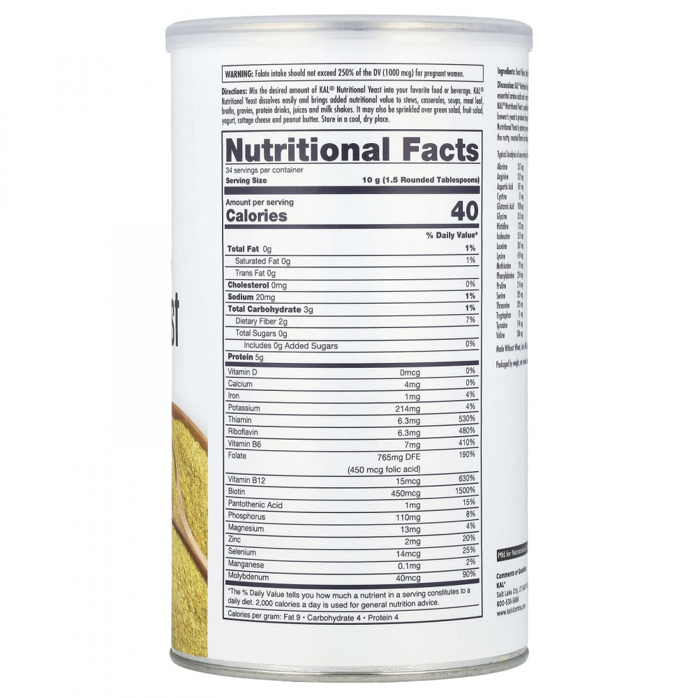 Пищевые дрожжи KAL выращиваются на специально подготовленной черной патоке. Такая питательная среда позволяет выращивать дрожжевые хлопья, содержащие полный набор незаменимых аминокислот и сбалансированную дозу витаминов группы B. Эти растительные хлопья премиум-качества не содержат подсластителей, ГМО, а также содержат мало жира и натрия. В пищевые дрожжи KAL добавлены витамины группы B для увеличения их питательной ценности. Традиционные пивные дрожжи изготавливаются в процессе пивоварения и могут иметь горьковатый привкус. Благодаря тому, что питательные что дрожжи KAL выращиваются на мелассе, они обладают естественным приятным вкусом. Поэкспериментируйте со вкусом жареных орехов, добавляя эти хлопья в свои любимые блюда.