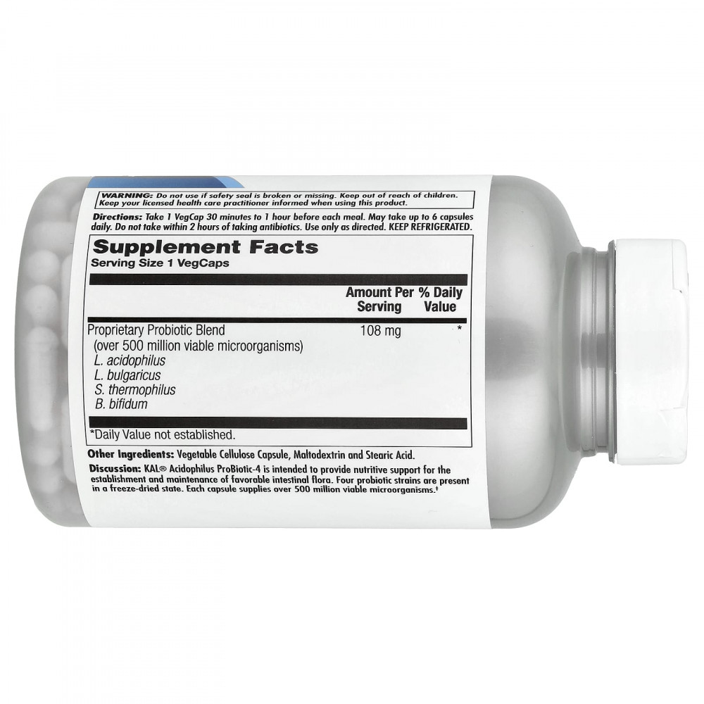 Описание. Ацидофильный комплекс с пробиотиком KAL® обеспечивает питательную поддержку для создания и поддержания благоприятной кишечной флоры. Четыре штамма пробиотиков находятся в сублимированном состоянии. Каждая капсула содержит более 500 млн жизнеспособных микроорганизмов.