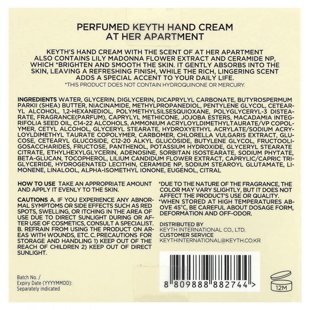 Крем для рук с ароматом At Her Flat от Keyth также содержит экстракт цветков мадонны (Lily Madonna) и керамид NP*, которые осветляют и разглаживают кожу. Он мягко впитывается в кожу, освежая, а насыщенный аромат расставляет акценты в вашей повседневной жизни.