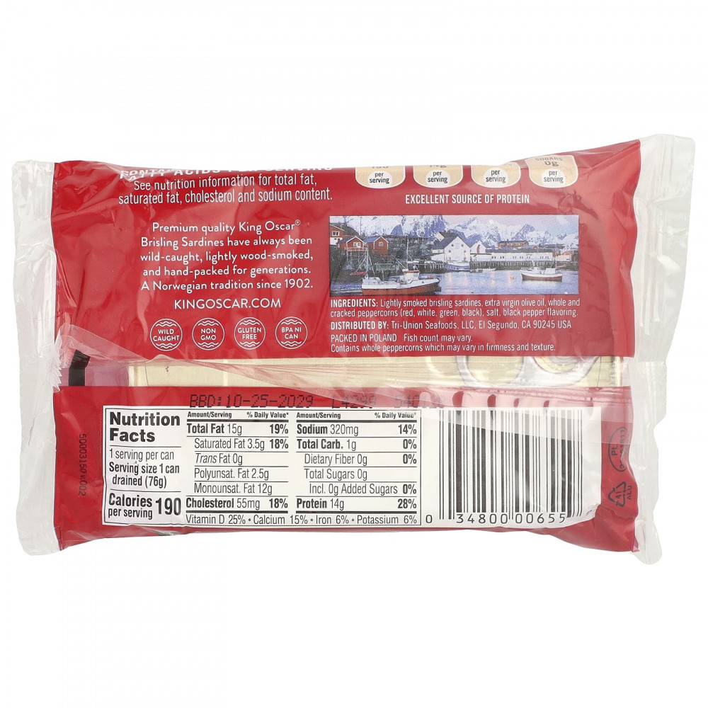 Lightly smoked brisling sardines, extra virgin olive oil, whole and cracked peppercorns (red, white, green, black), salt, black pepper flavoring.
