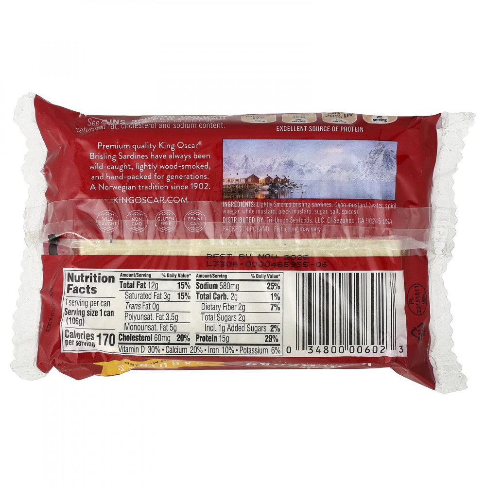 Сардины King Oscar® Brisling Sardines премиального качества всегда производятся из дикого улова, слегка копченые на дровах, и упаковываются вручную на протяжении поколений. Норвежская традиция с 1902 года.