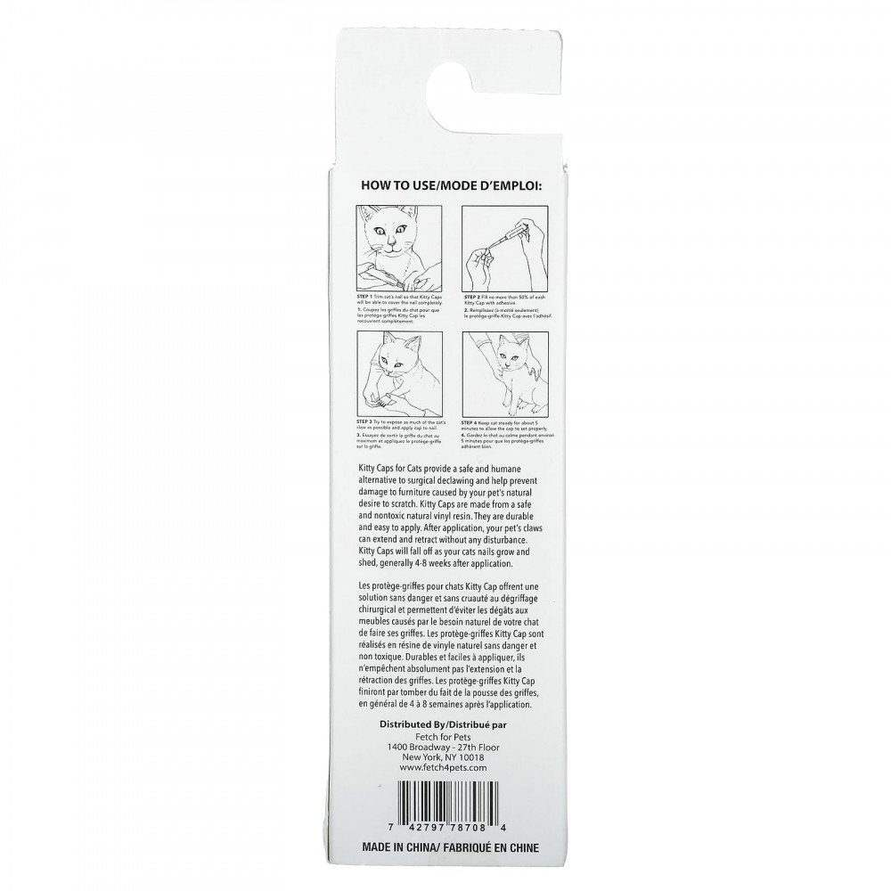 Кепки для кошек являются безопасной и гуманной альтернативой хирургическому удалению когтей и помогают предотвратить повреждение мебели, вызванное естественным желанием вашего питомца почесаться. Kitty Caps изготовлены из безопасной и нетоксичной натуральной виниловой смолы. Они прочные и легко наносятся. После нанесения когти вашего питомца могут выдвигаться и втягиваться без каких-либо проблем. Kitty Caps будет падать по мере роста или выпадения когтей, обычно через 4–8 недель после нанесения.
