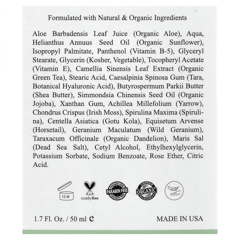 Сок листьев алоэ вера (Aloe barbadensis), вода (Aqua), масло из семян подсолнечника (Helianthus annuus), изопропилпальмитат, пантенол (витамин B5), глицерил стеарат, глицерин (кошерный, овощной), токоферилацетат (витамин Е), экстракт листьев камелии китайской (органический зеленый чай), стеариновая кислота, камедь цезальпинии (Caesalpinia spinosa), растительная гиалуроновая кислота), масло ши (Butyrospermum parkii), масло семян органического жожоба (Simmondsia chinensis), ксантановая камедь, тысячелистник обыкновенный (Achillea millefolium), chondrus crispus (ирландский мох), спирулина максима (Spirulina), центелла азиатская (готу кола), хвощ полевой (Equisetum arvense), Geranium maculatum (дикая герань), taraxacum officinale (органический одуванчик), соль Мертвого моря (Maris sal), цетиловый спирт, этилгексилглицерин, сорбат калия, бензоат натрия, розовый эфир, лимонная кислота.