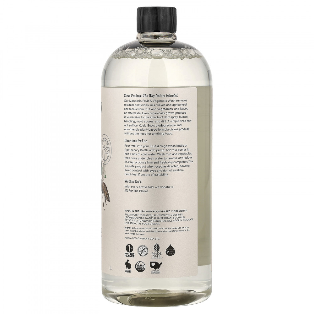 Наше средство для мытья фруктов и овощей с мандарином удаляет остаточные пестициды, масла, воск и сельскохозяйственные химикаты из фруктов и овощей и не оставляет послевкусия. Даже органически выращенные продукты подвержены воздействию струй воды, воздействия человека, спор плесени и грязи. Простого ополаскивания может быть недостаточно. Биоразлагаемая и экологически безопасная растительная формула Koala Eco очищает продукты без использования каких-либо токсичных веществ.