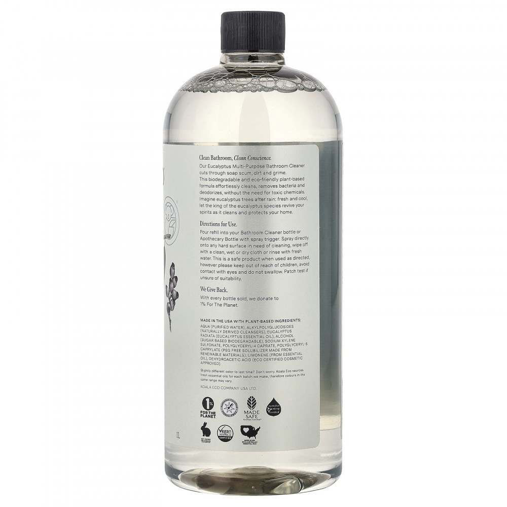 Наше универсальное очиститель для ванной комнаты с эвкалиптом удаляет мыльный налет и грязь. Это биоразлагаемое и экологичное средство на растительной основе легко очищает, удаляет бактерии и дезодорирует без использования токсичных химических веществ. Представьте себе эвкалипты после дождя: позвольте королю видов эвкалипта освежить и защитить ваш дом, поскольку он свежий и прохладный.