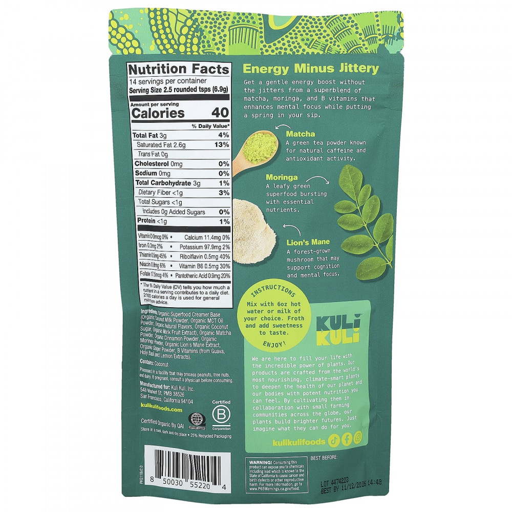 Получите мягкий заряд энергии без дрожи от суперсмеси матча, моринги и витаминов группы B, которая повышает умственную концентрацию и дает заряд энергии для вашего глотка.