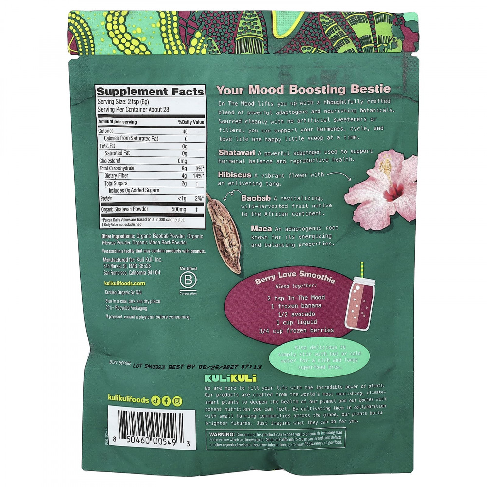 In The Mood поднимает настроение благодаря тщательно разработанной смеси эффективных адаптогенов и питательных растительных компонентов. Чистое происхождение: без искусственных подсластителей и наполнителей, вы можете поддерживать свои гормоны, цикл и личную жизнь с помощью одной маленькой мерной ложки за раз.
