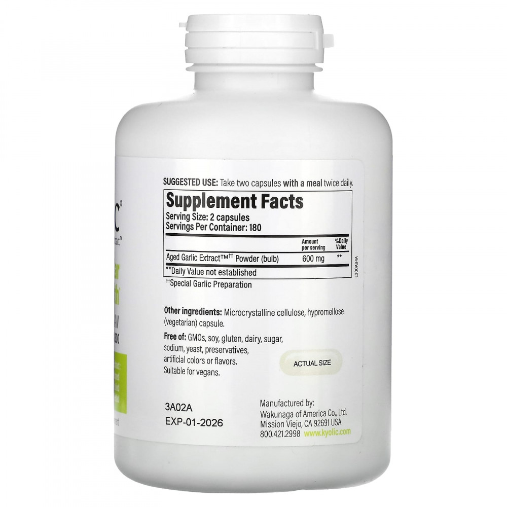 Выдержанный экстракт чеснока Aged Garlic Extract™ (AGE) от Kyolic® производится из органически выращенного чеснока. Он выдерживается с использованием запатентованного процесса для удаления вызывающих запах соединений, которые характерны для сырого чеснока, что увеличивает биодоступность полезных соединений.