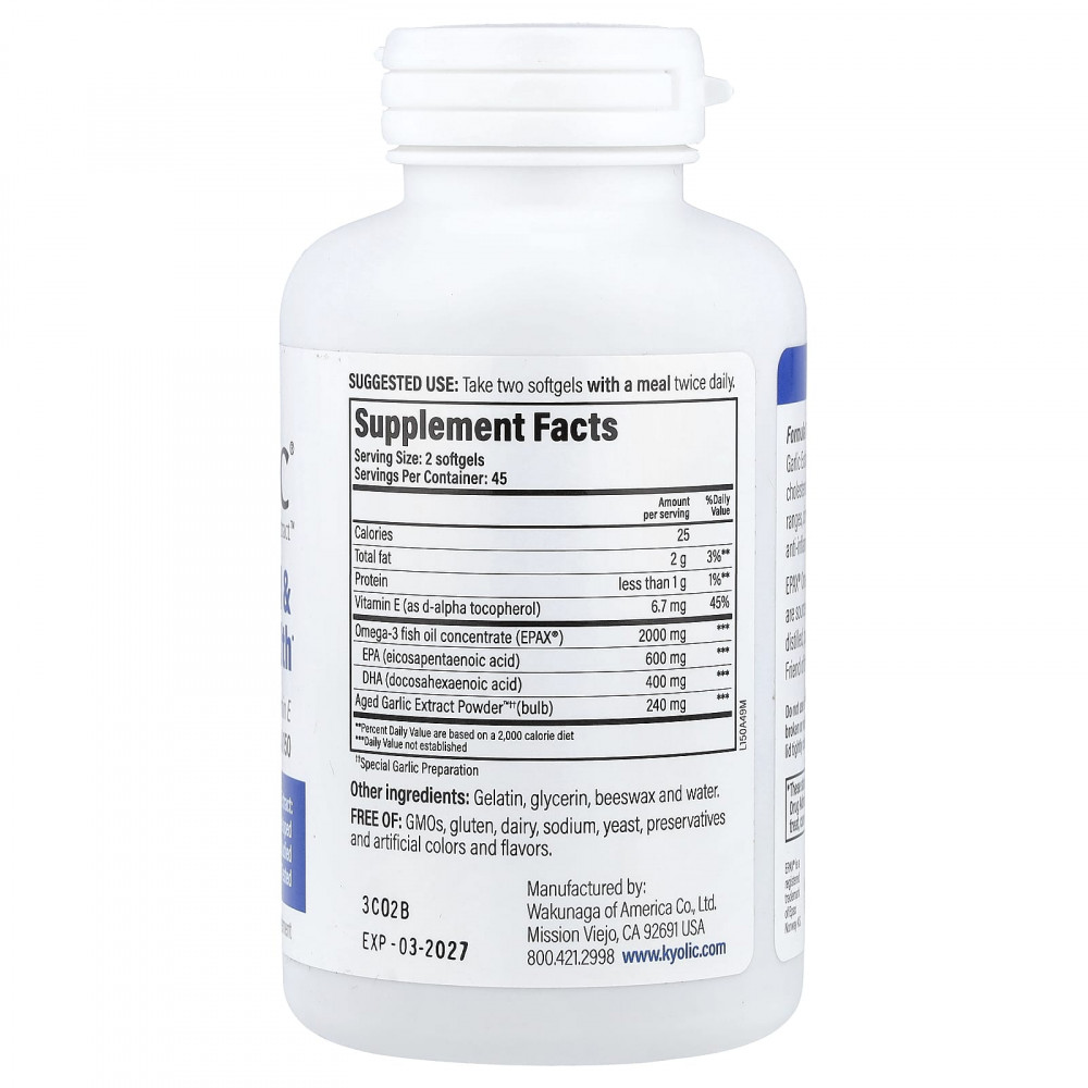 Формула 150 сочетает в себе выдержанный экстракт чеснока Aged Garlic Extract™ от Kyolic® без запаха, омега-3 и витамин E для поддержания уровня холестерина и триглицеридов в пределах нормы, улучшения кровообращения и естественной противовоспалительной реакции организма.