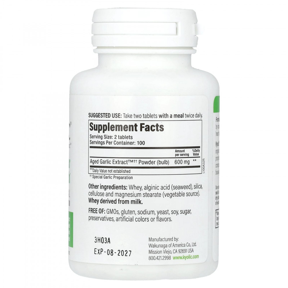 Выдержанный экстракт чеснока Aged Garlic Extract™ (AGE) от Kyolic® производится из органически выращенного чеснока. Он выдерживается с использованием запатентованного процесса для удаления вызывающих запах соединений, которые характерны для сырого чеснока, и увеличения биодоступности полезных соединений.