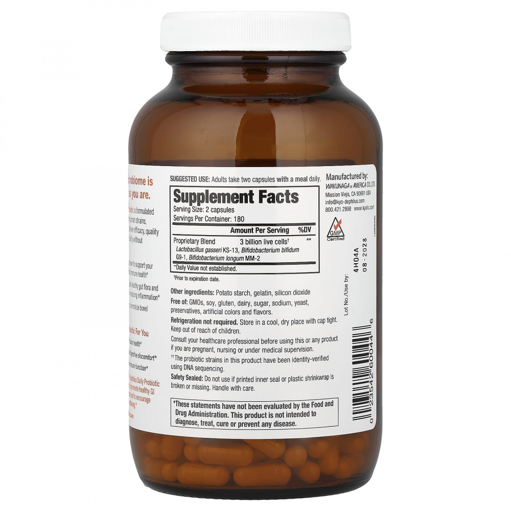 Принимайте по две капсулы пробиотика Kyo-Dophilus для ежедневного приема каждый день во время еды, чтобы поддержать здоровье желудочно-кишечного тракта и иммунной системы, а также общее самочувствие.