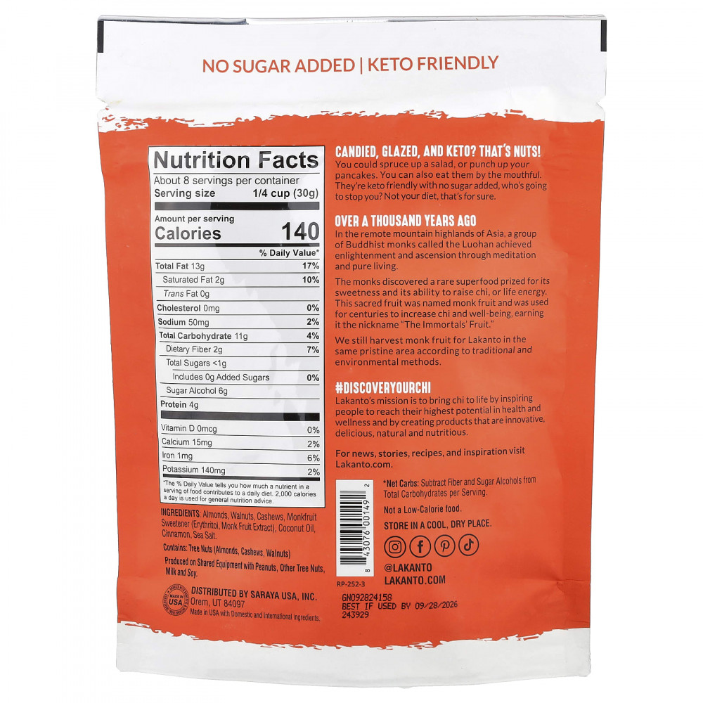 Миндаль, грецкие орехи, кешью, подсластитель из монахов (эритритол, экстракт архата), кокосовое масло, корица, морская соль.