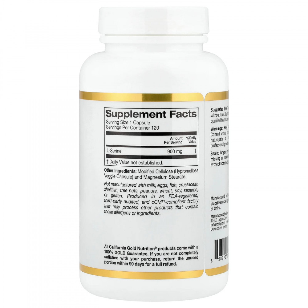 L-серин California Gold Nutrition® содержит аминокислоту L-серин в растительных капсулах. Добавка подходит для вегетарианцев и веганов и не содержит глютена, ГМО и сои.