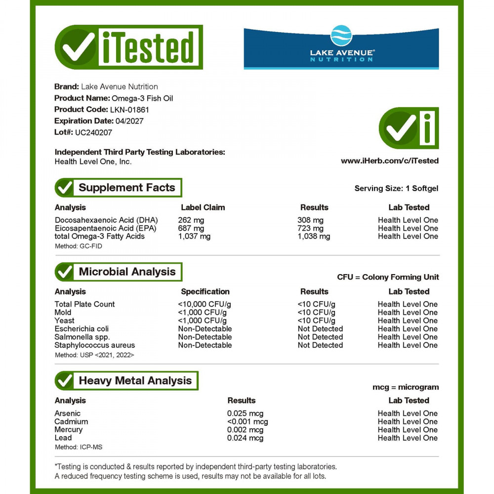Рыбий жир с омега-3 от Lake Avenue Nutrition содержит обе триглицеридные формы жирных кислот — ЭПК и ДГК, — в капсулах из рыбьего желатина.