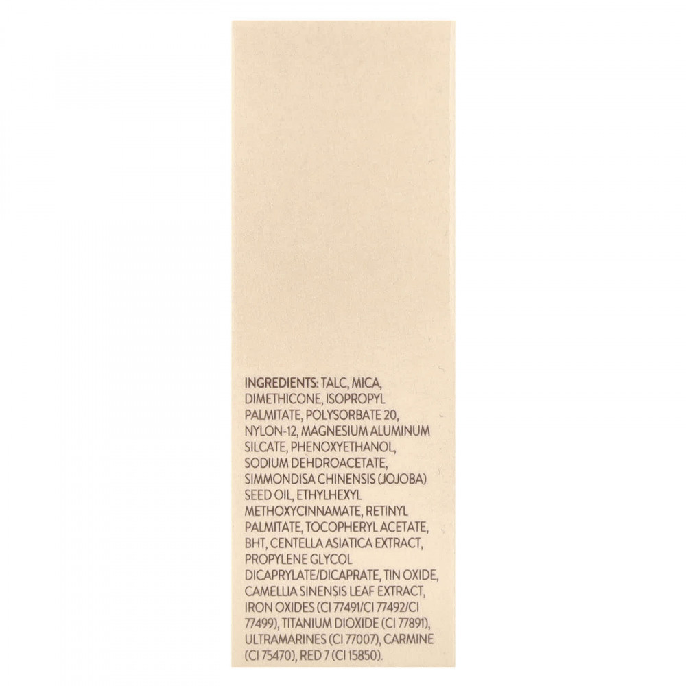 Тальк, слюда, диметикон, изопропилпальмитат, полисорбат 20 нейлон-12, силикат магния и алюминия, феноксиэтанол, дегдроацетат натрия, масло семян жожоба (Simmondisa chinensis), этилгексил метоксициннамат, ретинилпальмитат, токоферилацетат, бутилгидрокситолуол, экстракт готу колы (Centella asiatica), пропиленгликоль дикаприлат/дикапрат, оксид олова, экстракт листьев камелии китайской (Camellia sinensis), оксиды железа (CI 77491 / CI 77492 / CI 77499), диоксид титана (CI 77891), ультрамарины (CI 77007), кармин (CI 75470), красный 7 (CI 15850).