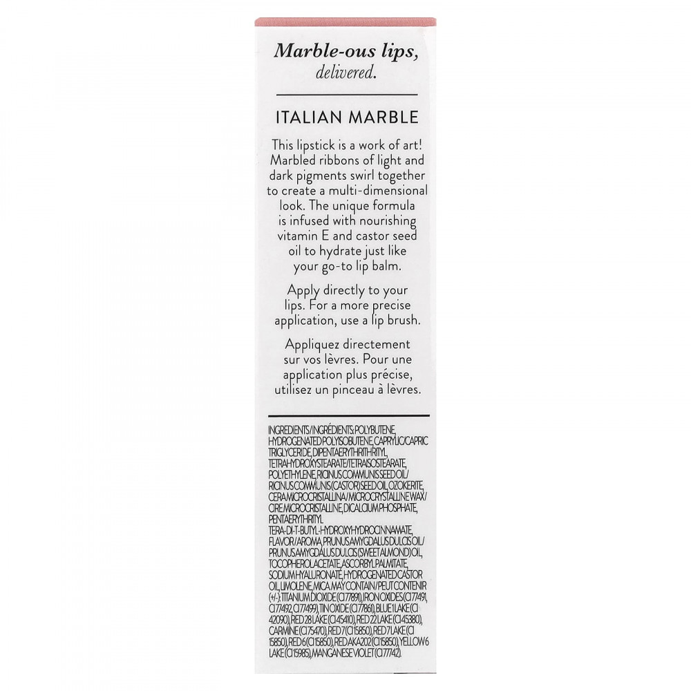 Эта помада - произведение искусства! Мраморные ленты из светлых и темных пигментов смешиваются друг с другом, создавая эффектный образ. Уникальная формула содержит питательный витамин Е и касторовое масло, которые увлажняют кожу, как обычный бальзам для губ.