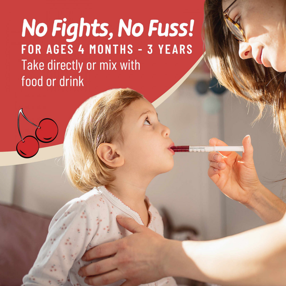 Хорошо встряхните перед использованием. Снимите крышку и полностью нажмите на шприц. Вставьте наконечник шприца в середину самоуплотняющегося адаптера, пока цилиндр не будет на одном уровне с адаптером. Переверните флакон, не снимая шприца, и наберите желаемую дозу. 4–12 месяцев: Наполняйте шприц до уровня 1 мл ежедневно. 1–3 года: Наполняйте шприц до 0,5 мл ежедневно. Медленно выдавите жидкость по направлению к внутренней стороне щеки ребенка. Мыть руки и тщательно высушивать шприц после каждого использования.