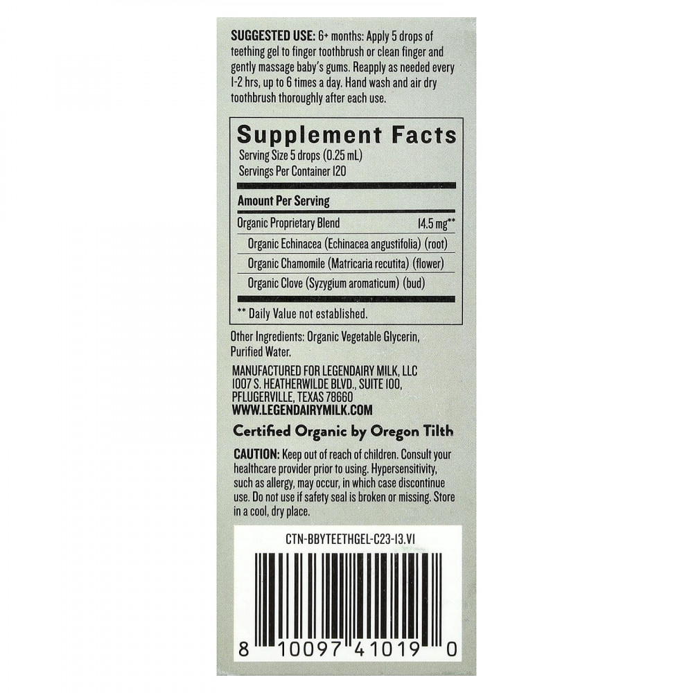6+ месяцев: Нанесите 5 капель геля для прорезывания зубов на зубную щетку или чистый палец и аккуратно помассируйте десны ребенка. Повторно наносите по мере необходимости каждые 1–2 часа, до 6 раз в день. Тщательно мойте зубную щетку и сушите на воздухе после каждого использования.