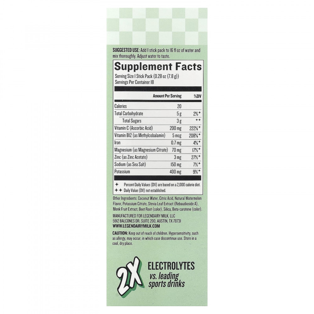 Кокосовая вода, лимонная кислота, натуральный ароматизатор «Арбуз», цитрат калия, экстракт листьев стевии (ребаудиозид А), экстракт архата, свекла (краситель), диоксид кремния, бета-каротин (краситель).
