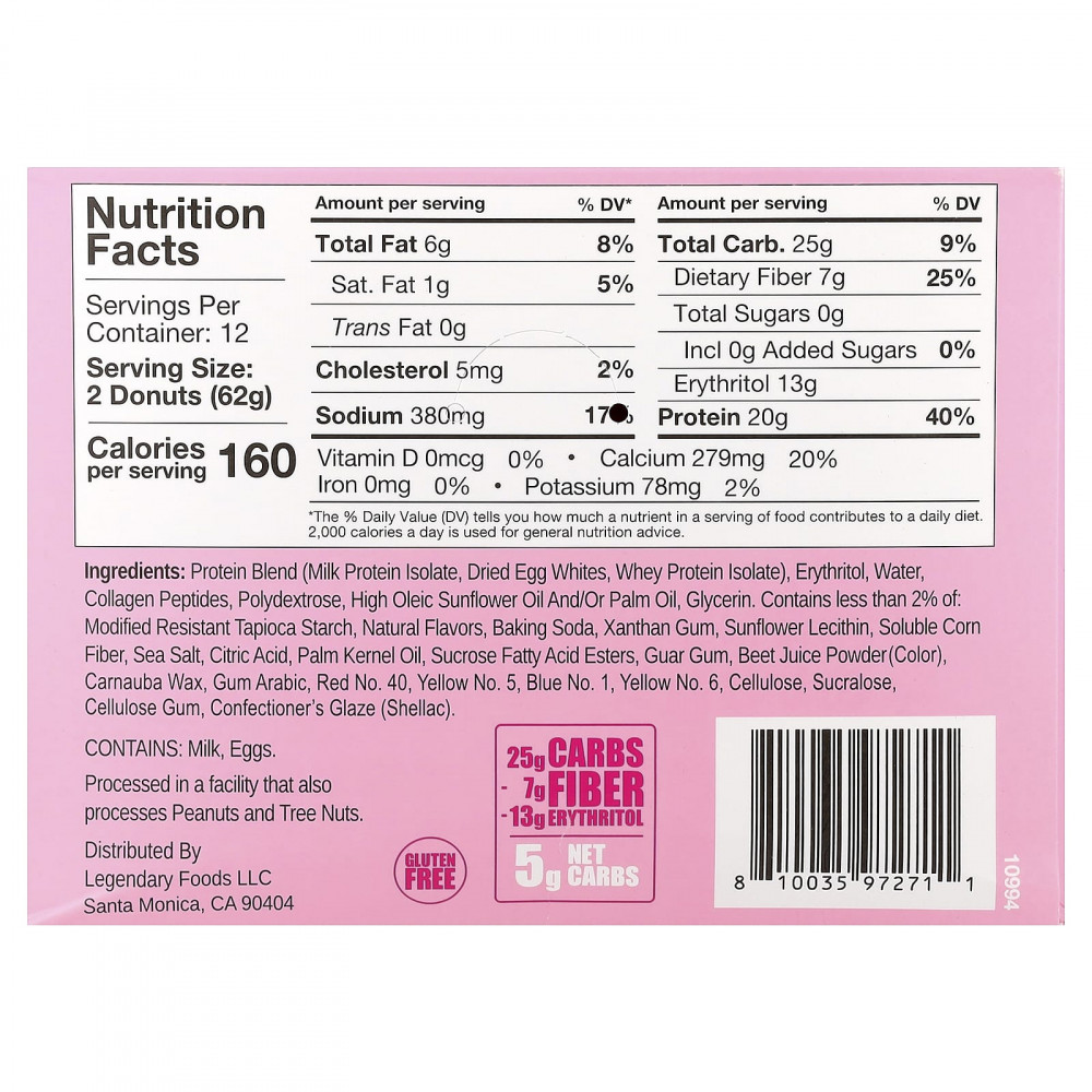 Протеиновая смесь (изолят молочного протеина, высушенный яичный белок, изолят сывороточного протеина), эритритол, вода, пептиды коллагена, полидекстроза, высокоолеиновое подсолнечное масло и/или пальмовое масло, глицерин. Содержит менее 2%: модифицированный устойчивый тапиоковый крахмал, натуральные ароматизаторы, пищевая сода, ксантановая камедь, подсолнечный лецитин, растворимая кукурузная клетчатка, морская соль, лимонная кислота, пальмоядровое масло, эфиры жирных кислот сахарозы, гуаровая камедь, порошок из сока свеклы (краситель), карнаубский воск, аравийская камедь, краситель красный, краситель жёлтый 5, краситель синий 1, краситель жёлтый 6, целлюлоза, сукралоза, целлюлозная камедь, кондитерская глазурь (шеллак).