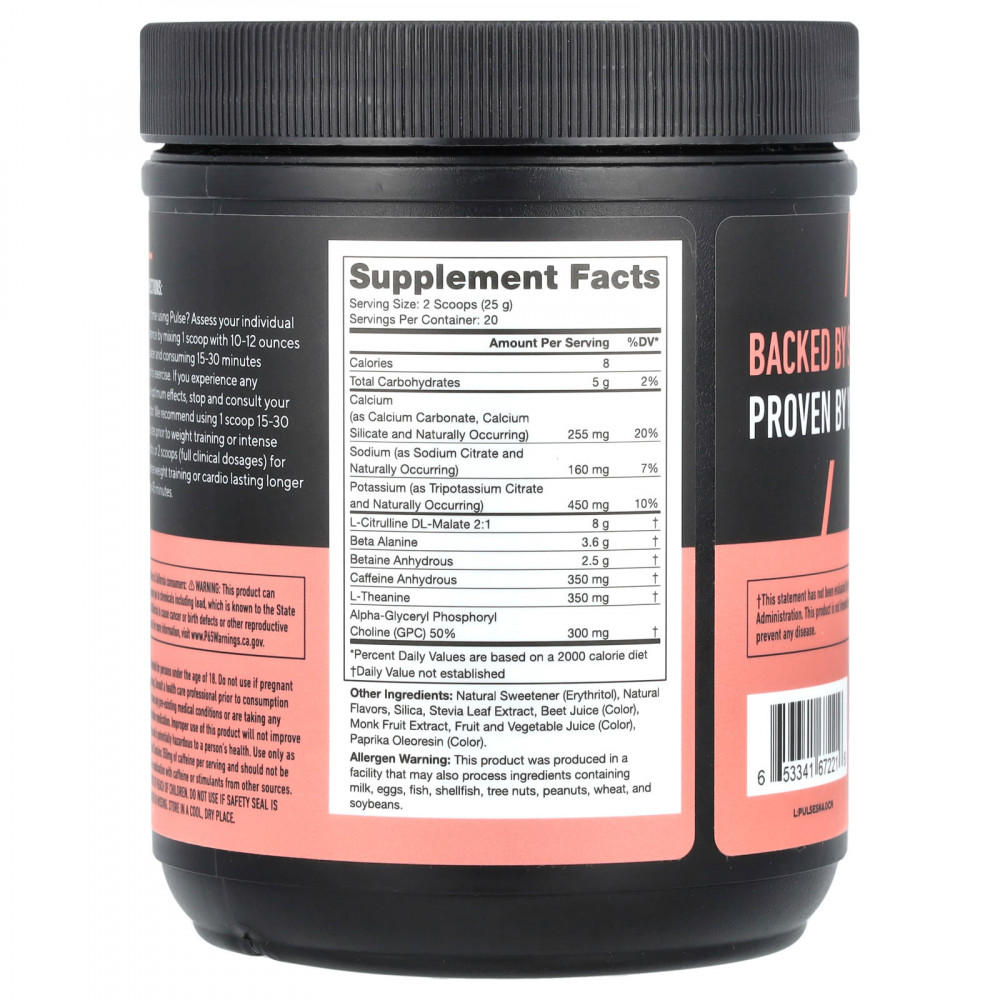 Впервые пользуетесь Pulse? Оцените свою переносимость, смешав 1 мерную ложку с 10–12 унциями воды и выпив за 15–30 минут до тренировки. Если вы почувствуете какие-либо неоптимальные эффекты, прекратите прием и обратитесь к врачу. Мы рекомендуем принимать по 1 мерной ложке за 15–30 минут до силовой тренировки или интенсивной кардиотренировки, или 2 мерные ложки (в полной клинической дозировке) для интенсивных силовых тренировок или кардиотренировок продолжительностью более 45 минут.