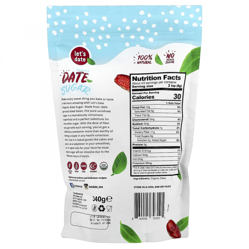 Сделайте каждую выпечку или вкус вкуснее с органическим финиковым сахаром Let's Date. Этот чистый нерафинированный сахар, изготовленный из 100% молотых сушеных фиников, является удивительно удобным суперфудом и идеальной заменой любого другого сахара. С той дозой клетчатки, которую вы получаете с каждой порцией, вы получаете восхитительный подсластитель, более чем достойный быть основным продуктом любой здоровой диеты. Используйте его в выпечке, например, в тортах и пирогах, в качестве подсластителя в смузи или в специях для вашего любимого мяса. Финиковый сахар не растворяется, поскольку финики имеют волокнистую структуру.