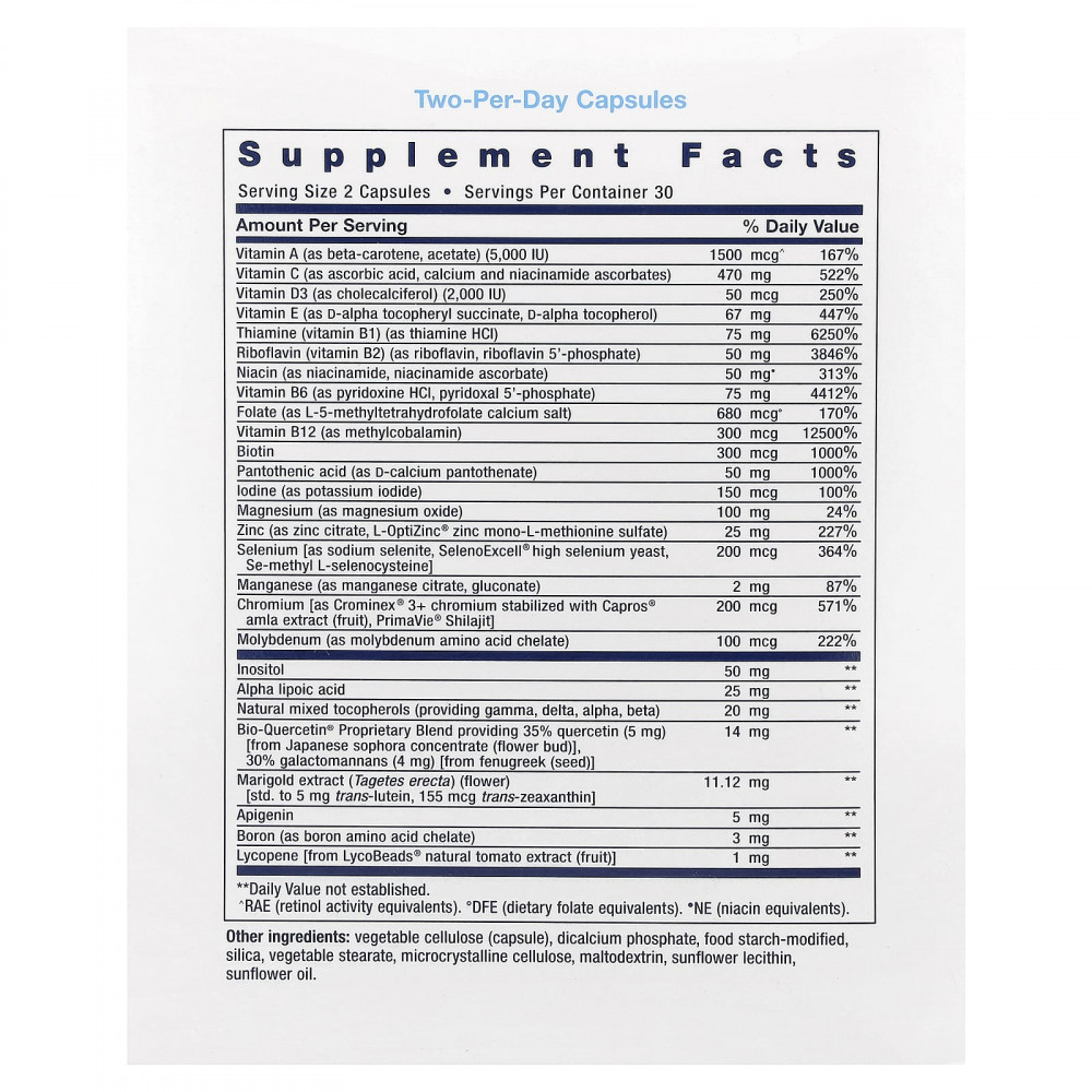 Капсулы для приема дважды в деньЭта формула содержит широкий спектр незаменимых витаминов, минералов и других питательных веществ, необходимых организму. Многие мультивитамины содержат только среднесуточную дозу витаминов и минералов. Наша формула для приема дважды в день превосходит Centrum® Silver® для взрослых старше 50 лет по 10 показателям, включая большее количество витаминов B1, B3, B6, B12, C, D и E; биотин; селен; цинк.